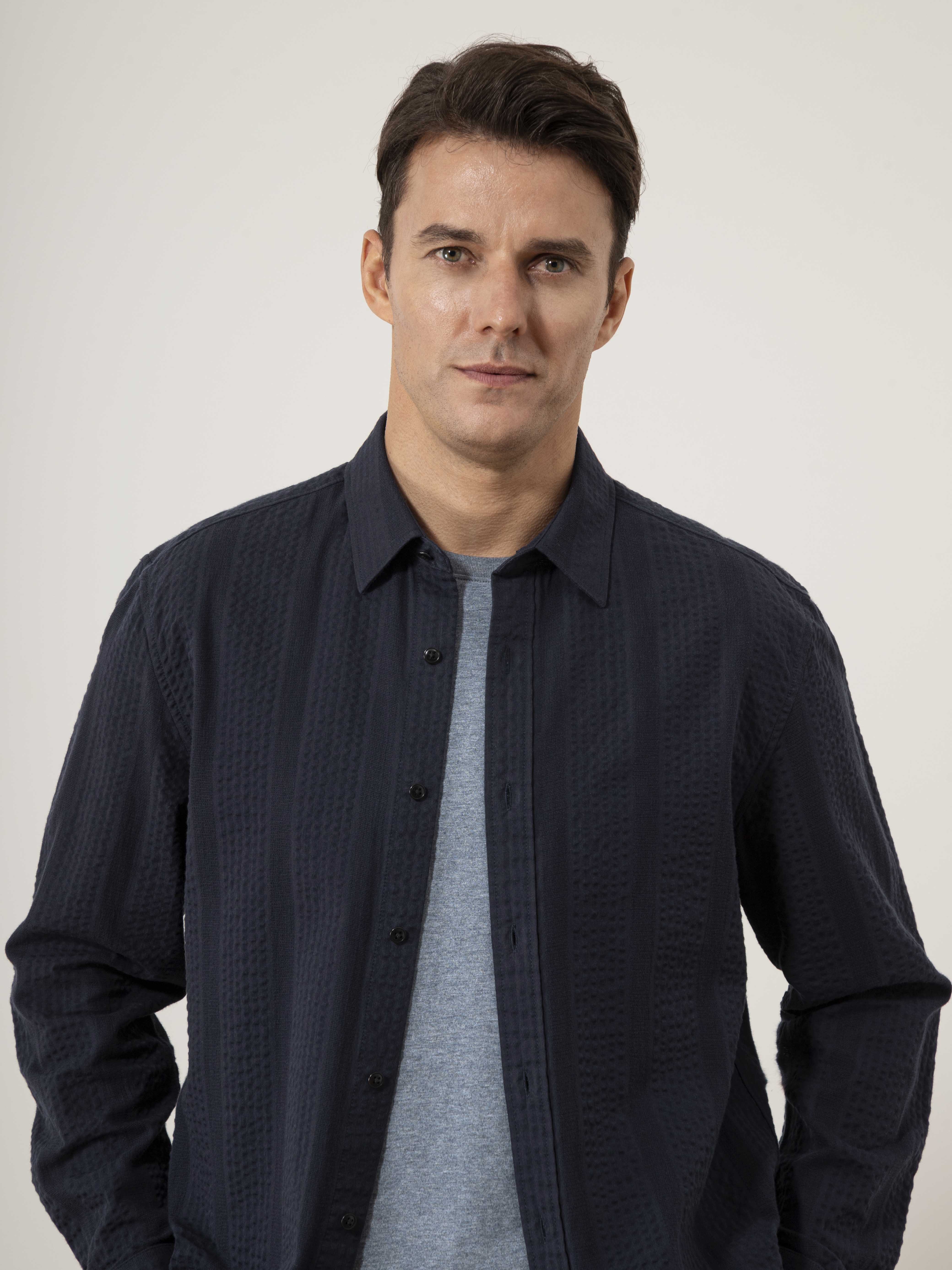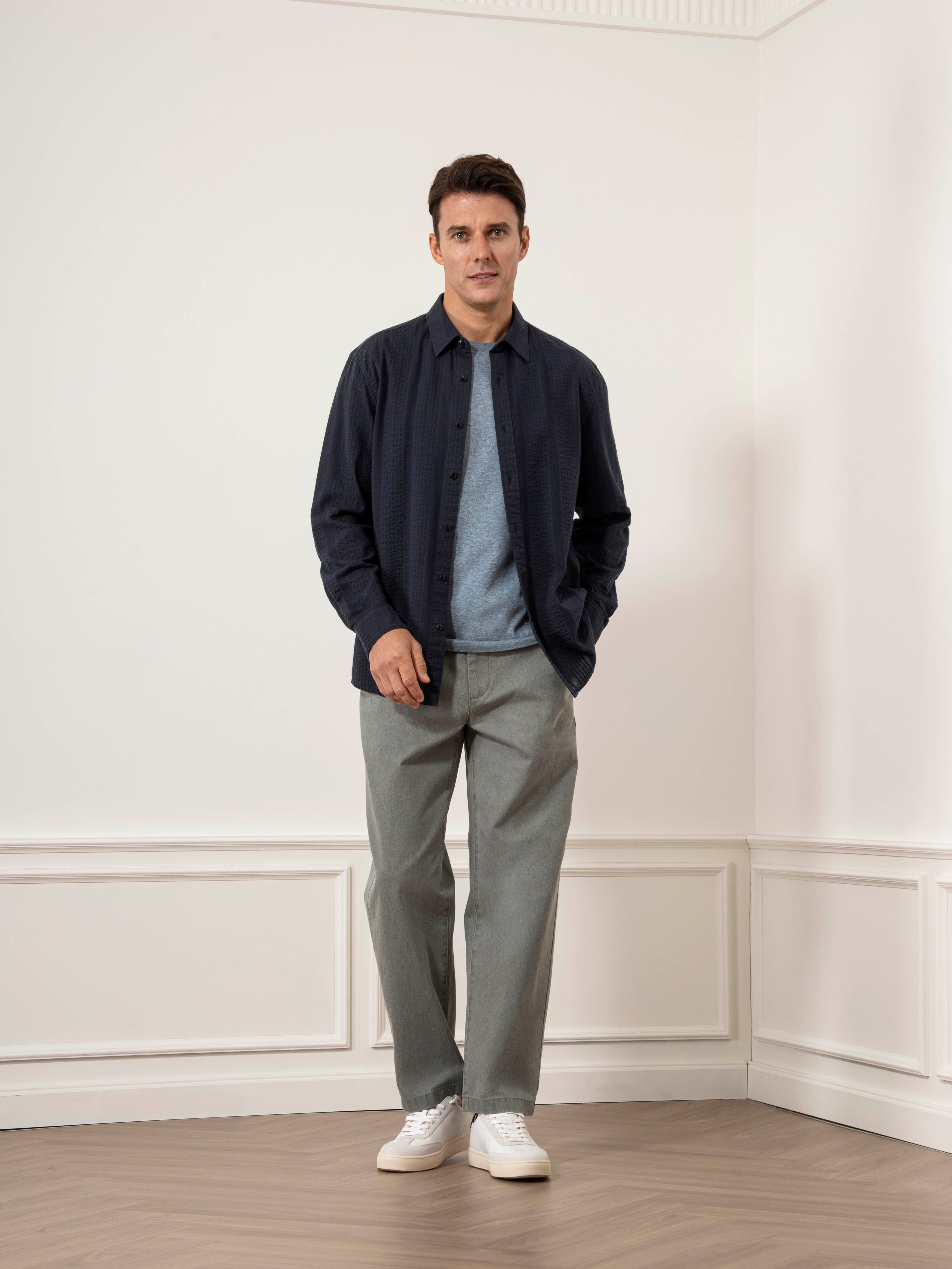 The Varick Dobby Stripe Overshirt layers with precision through premium European fabric featuring textured seersucker stripes and novelty patterns. The lightweight, straight-cut silhouette works effortlessly over T-shirts and base layers, delivering visual depth and breathability. A distinctive piece that elevates casual outfits while maintaining comfort—perfect for transitioning seamlessly throughout your day.